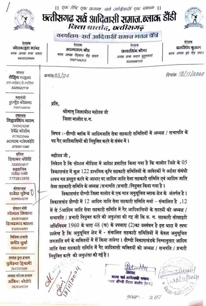 बालोद। सोशल मीडिया प्लेटफॉर्म में इन दिनों जिले के 122 सेवा सहकारी समितियों में नियुक्त किए गए अध्यक्ष, सभापति और प्रभारियों की सूची वायरल हो रही है. इस फर्जी वायरल सूची के झांसे में आए छत्तीसगढ़ सर्व आदिवासी समाज डौंडी ब्लॉक ने कलेक्टर को पत्र लिखकर समितियों में गैर आदिवासियों को शामिल किए जाने पर आपत्ति जताई है.